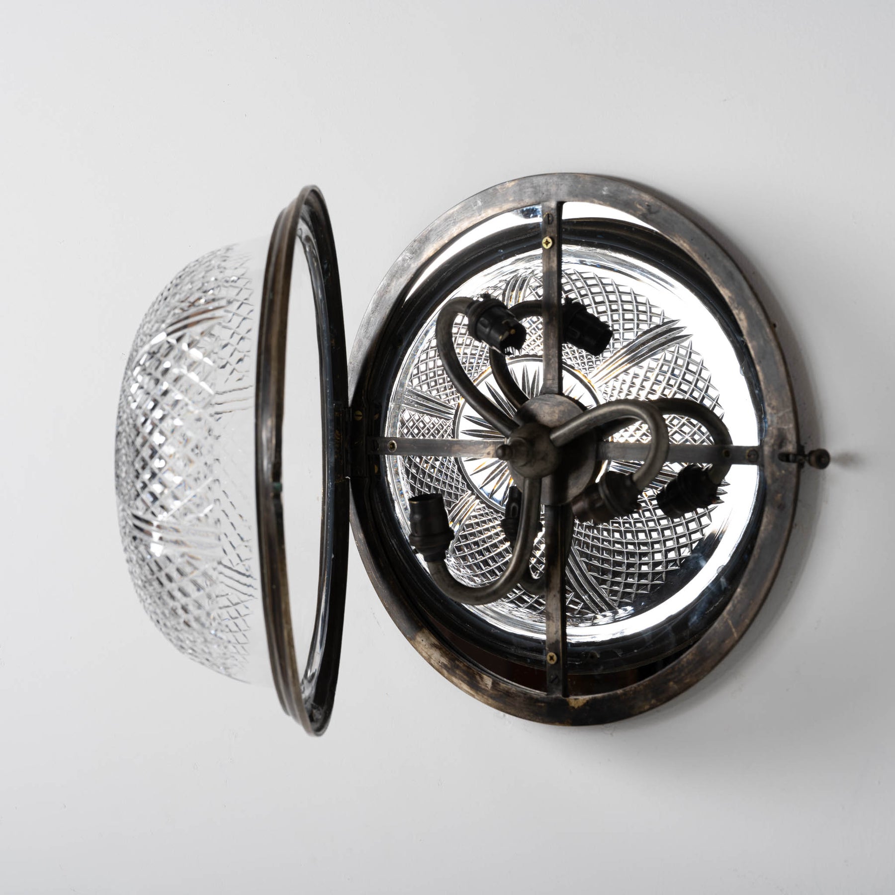 Internally, a three-arm brass lamp holder array sits above a newly installed polished reflector plate, maximising light output while maintaining historical accuracy. Designed to sit close to the ceiling, this fitting offers both presence and practicality—ideal for Art Deco apartments, luxury residential interiors, and elegant period hallways.