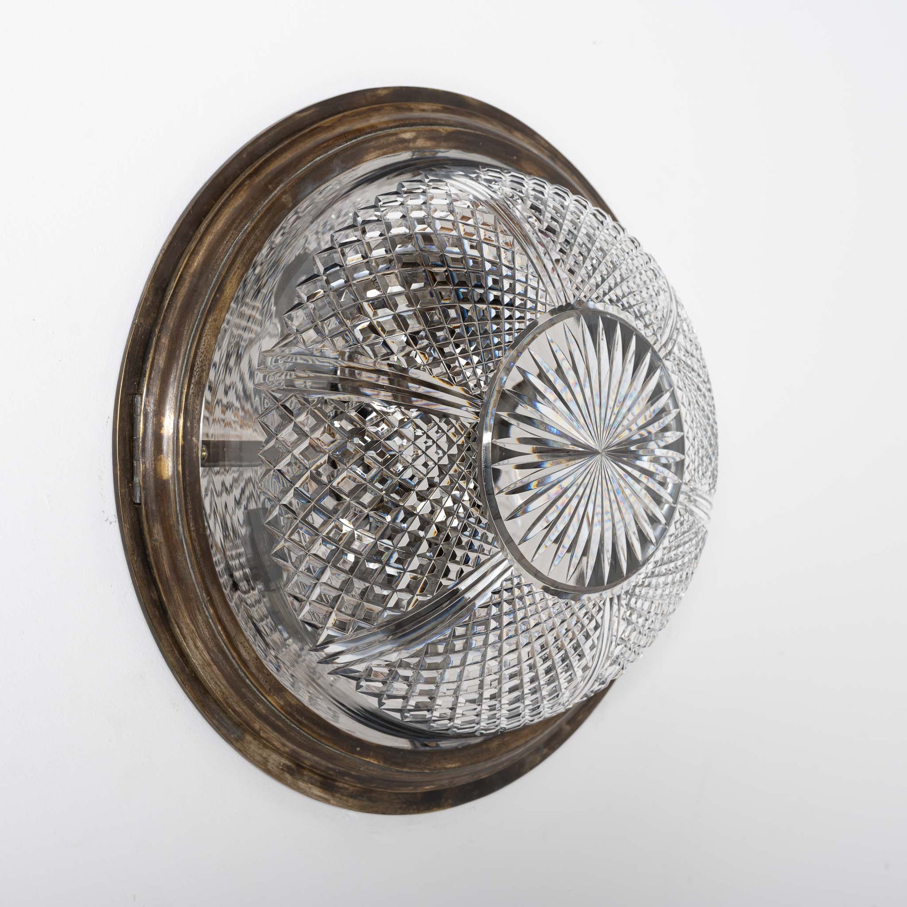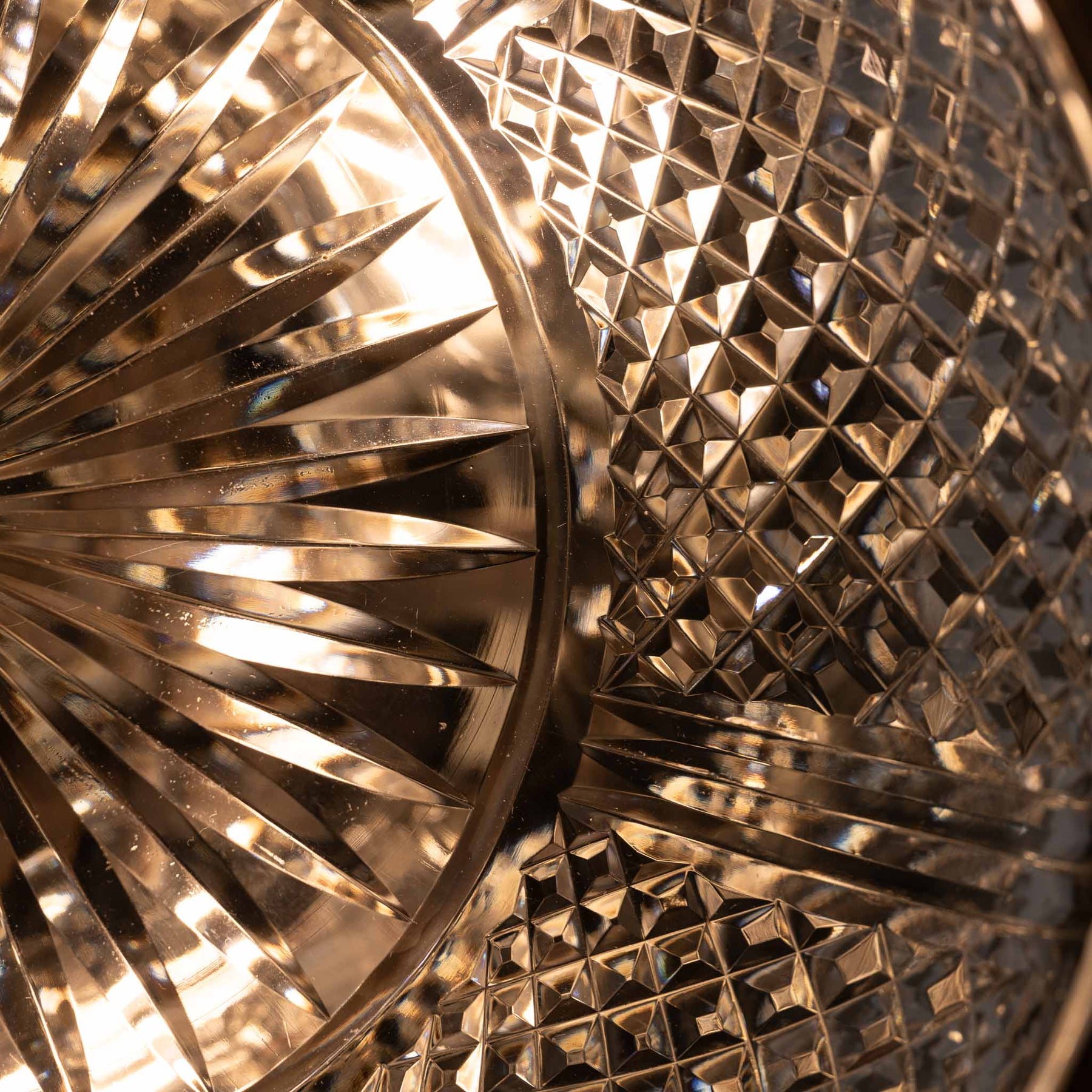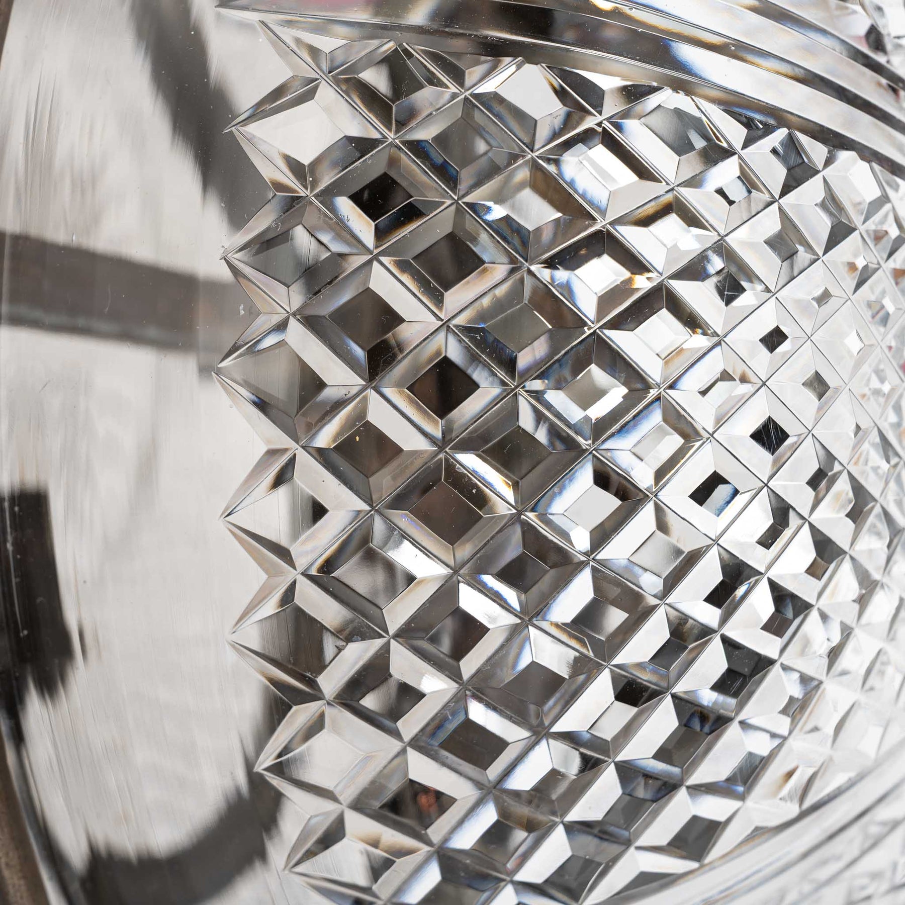 The heavy cast brass frame, finished in aged silver plate and sealed with a micro-crystalline wax, carries an understated patina that complements the brilliance of its deeply cut crystal glass bowl. The glass features intricate cross-hatched and radiating starburst patterns, expertly hand-finished to scatter and refract light with exceptional clarity.