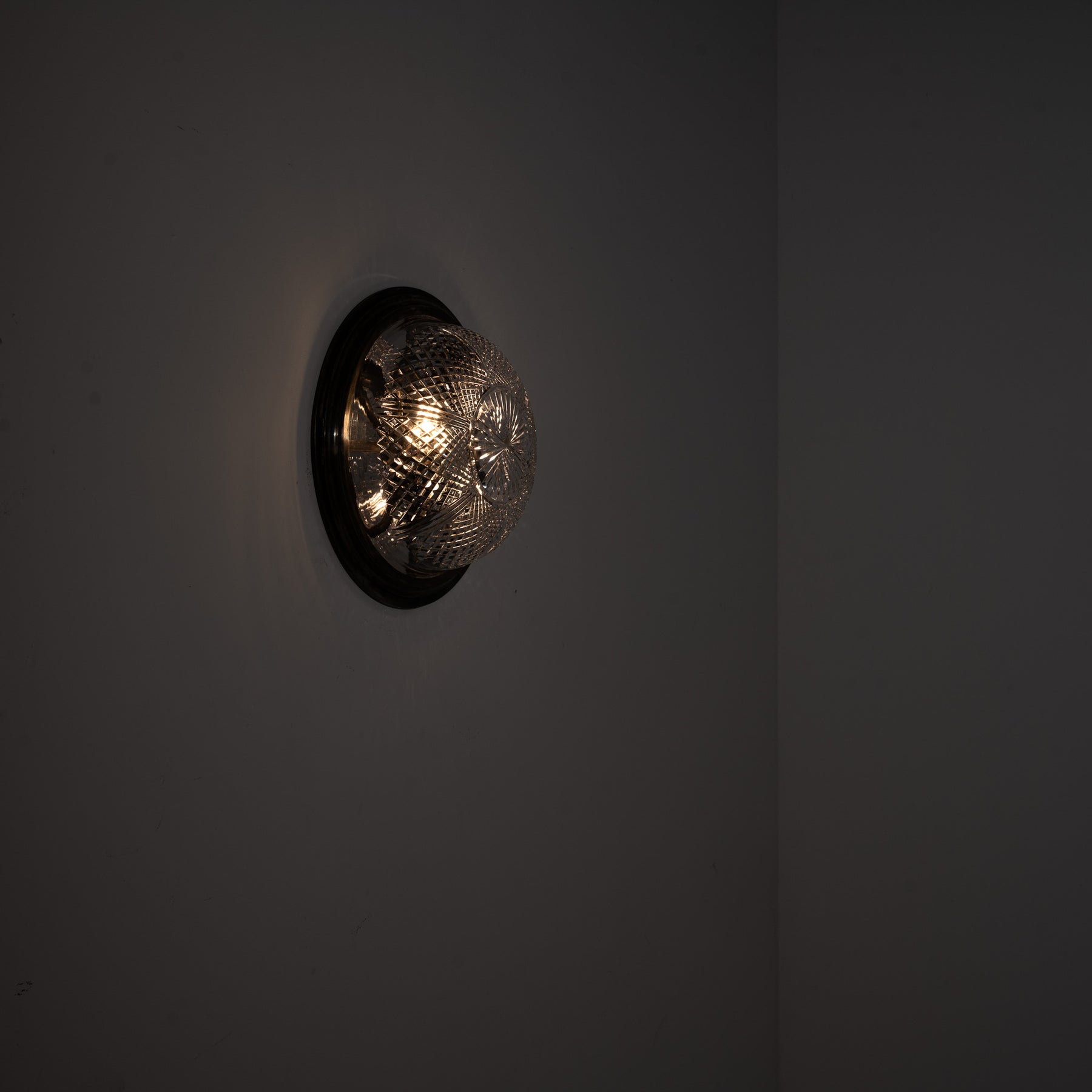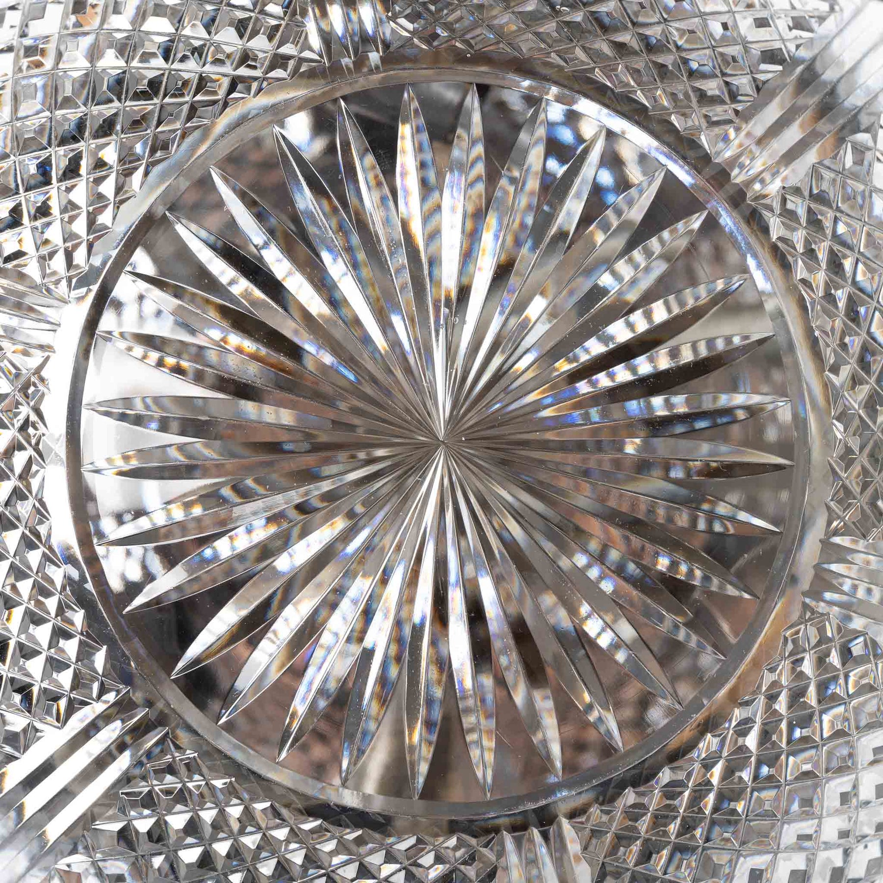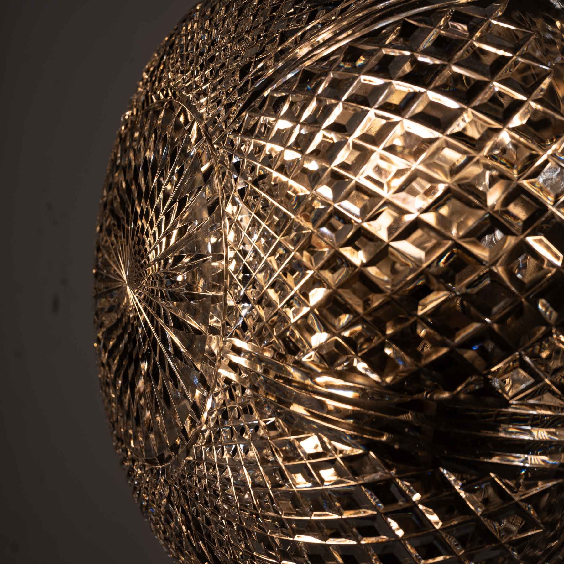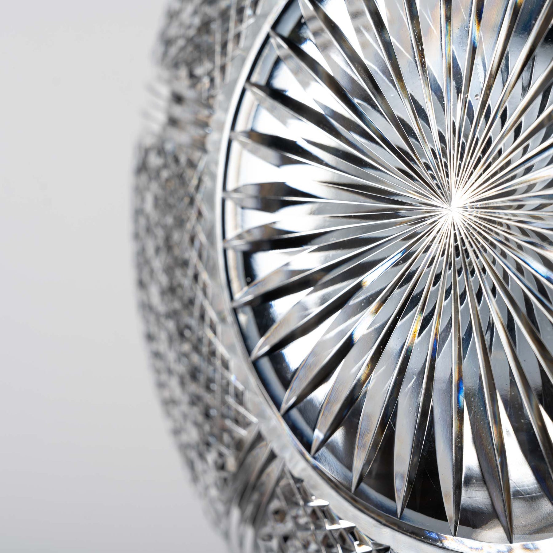 The heavy cast brass frame, finished in aged silver plate and sealed with a micro-crystalline wax, carries an understated patina that complements the brilliance of its deeply cut crystal glass bowl. The glass features intricate cross-hatched and radiating starburst patterns, expertly hand-finished to scatter and refract light with exceptional clarity.