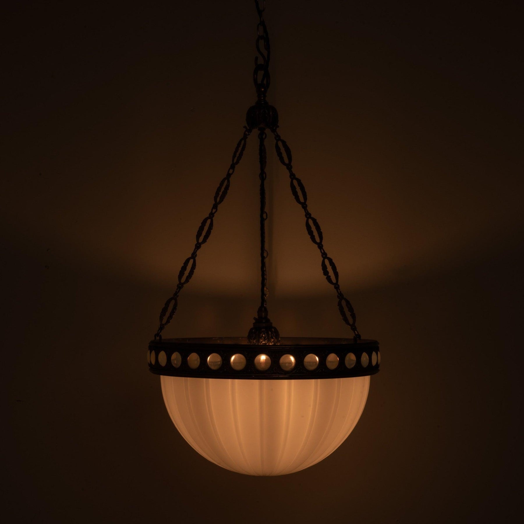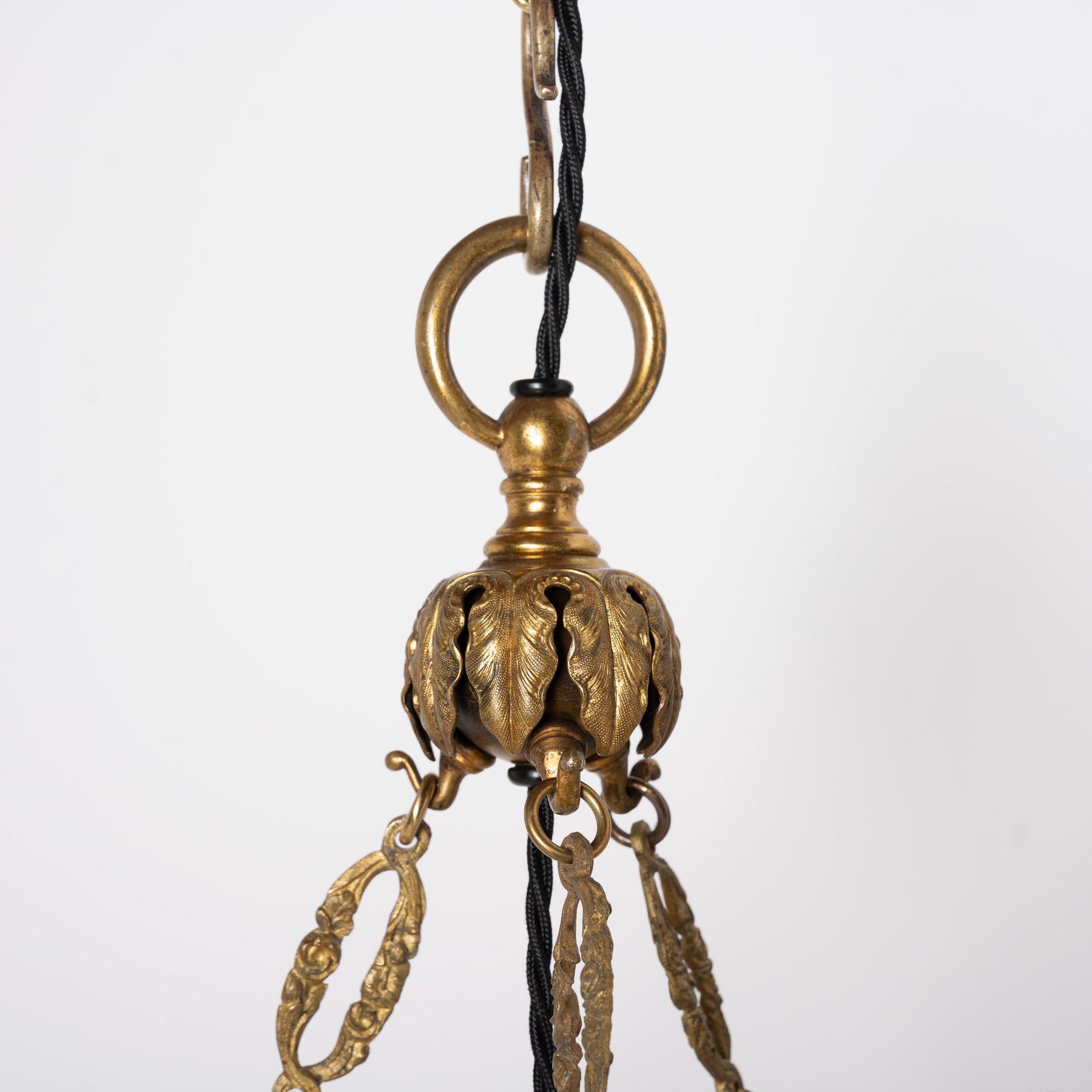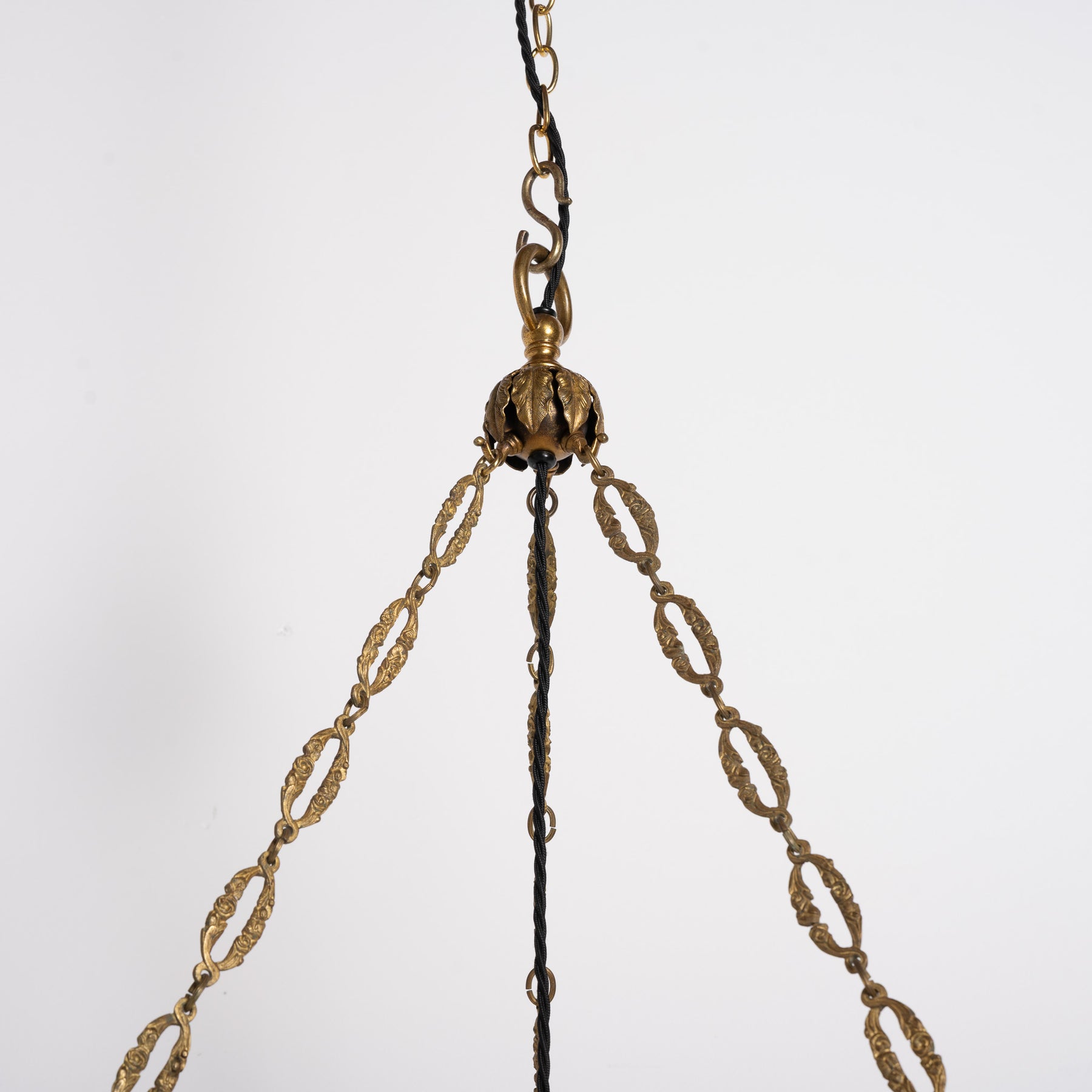 The plafonnier is suspended by a three-way decorative brass chain set with a matching cast brass ball hanger and leaf cap detail, perfectly complementing the Art Nouveau styling of the brasswork. The matching decorative bulb holder completes the fitting, ensuring visual continuity throughout the piece.