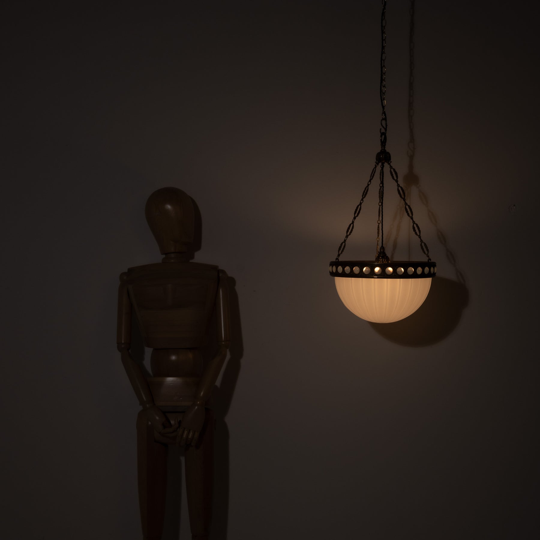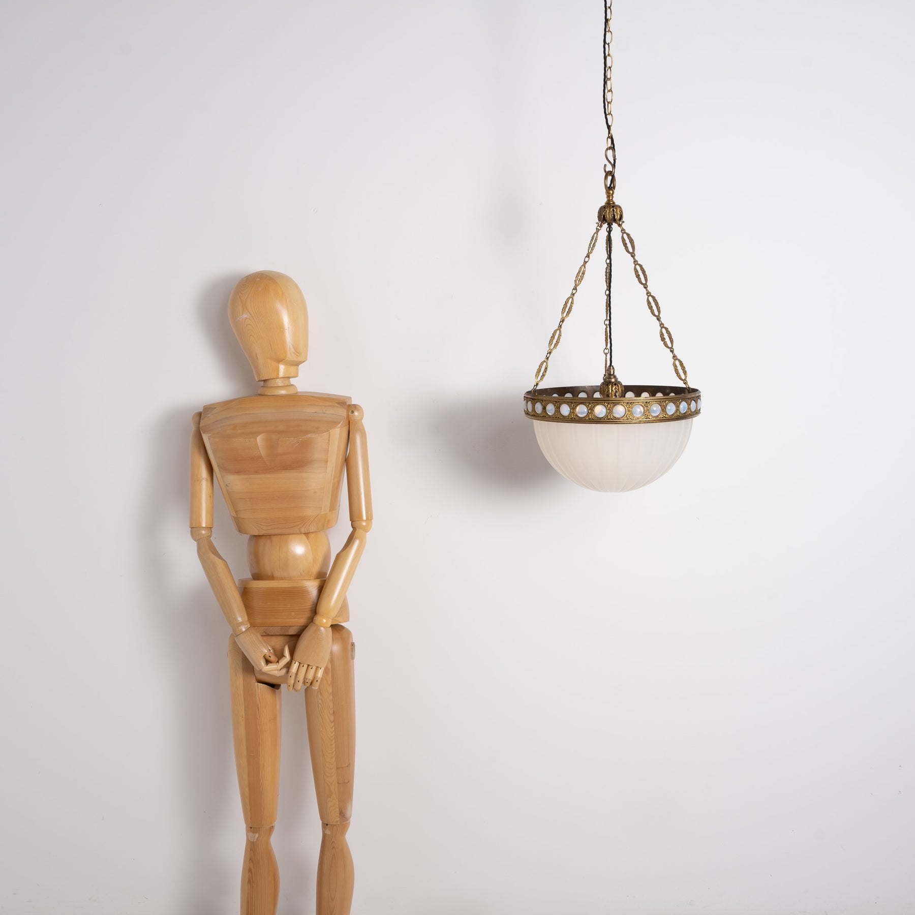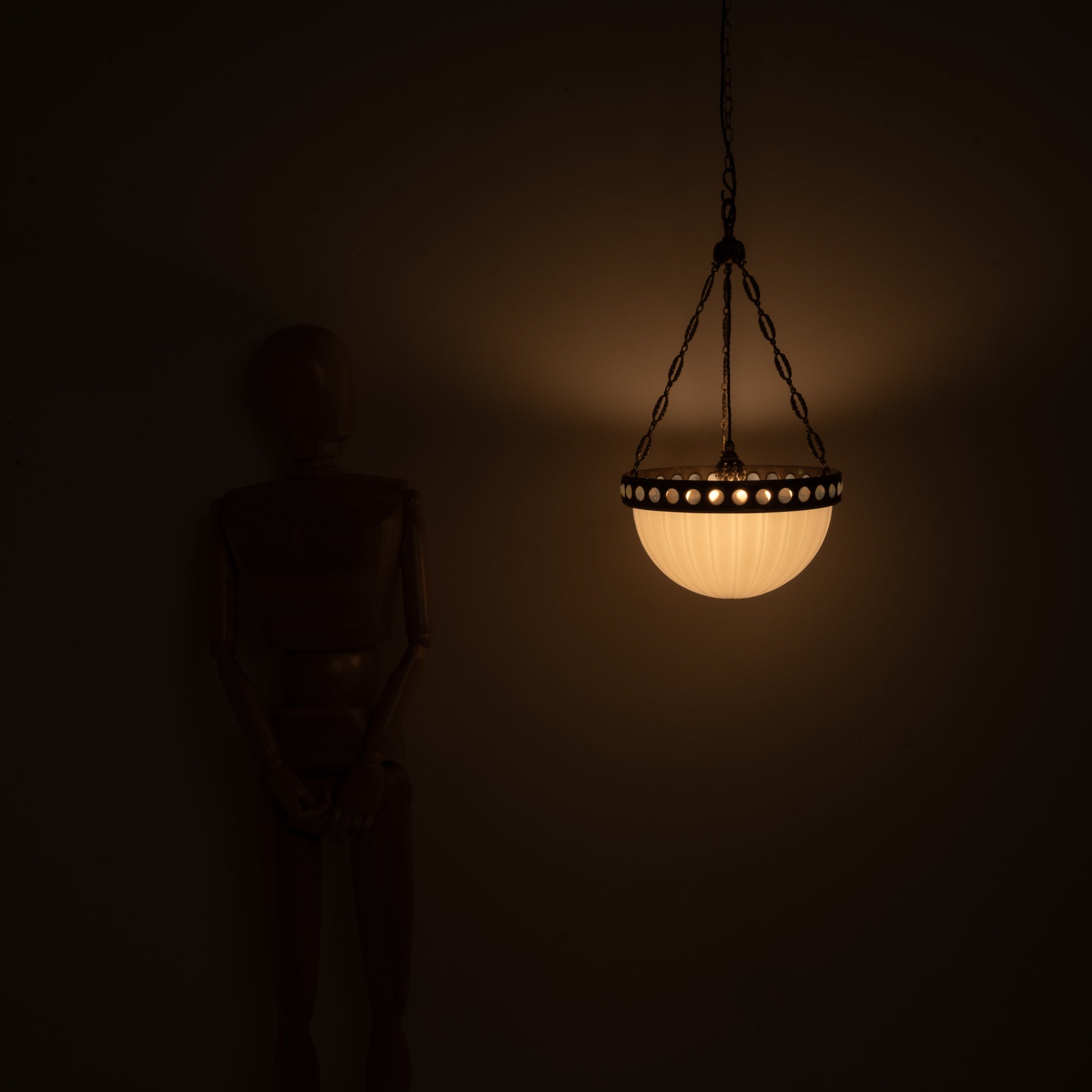 The plafonnier is suspended by a three-way decorative brass chain set with a matching cast brass ball hanger and leaf cap detail, perfectly complementing the Art Nouveau styling of the brasswork. The matching decorative bulb holder completes the fitting, ensuring visual continuity throughout the piece.