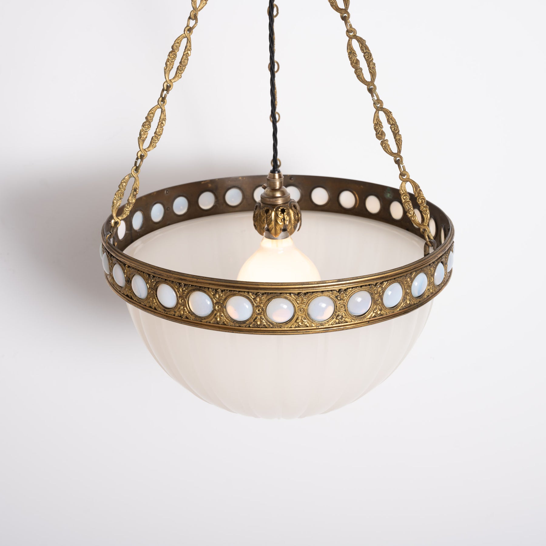 A beautifully rare and highly decorative Jefferson Moonstone plafonnier, featuring a deeply fluted 14-inch Moonstone glass bowl set within an ornate gilt brass ring inlaid with 31 convex opalescent glass insets. Each inset captures and reflects light differently, producing a captivating interplay of colour and tone when illuminated.