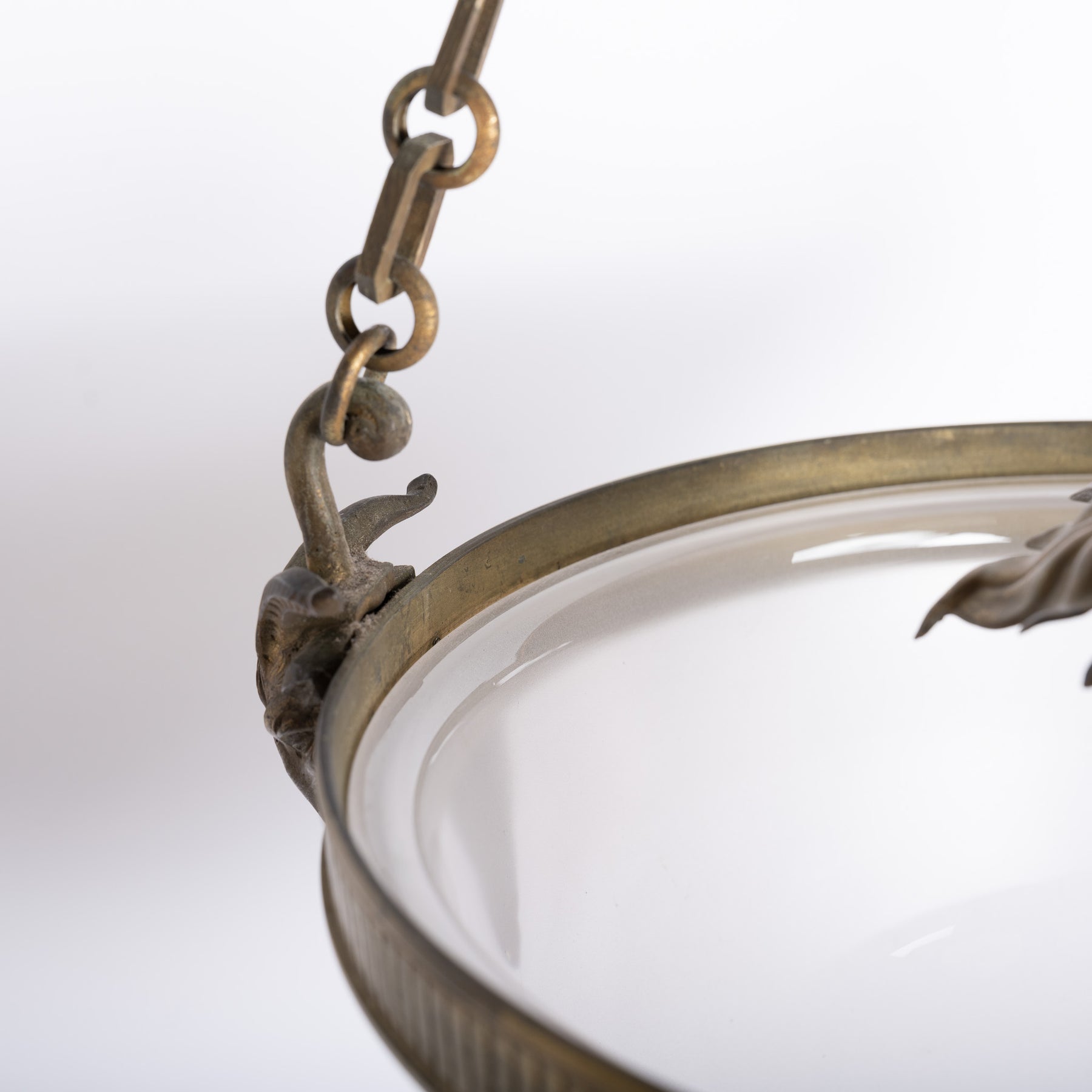 The lantern is constructed around a finely cast brass ring featuring exceptionally sculpted ram’s head mounts, a decorative motif frequently seen in high quality Victorian and Edwardian architectural lighting. Each ram’s head is crisply cast with strong sculptural detail, demonstrating the quality and craftsmanship associated with Osler fittings of this period.