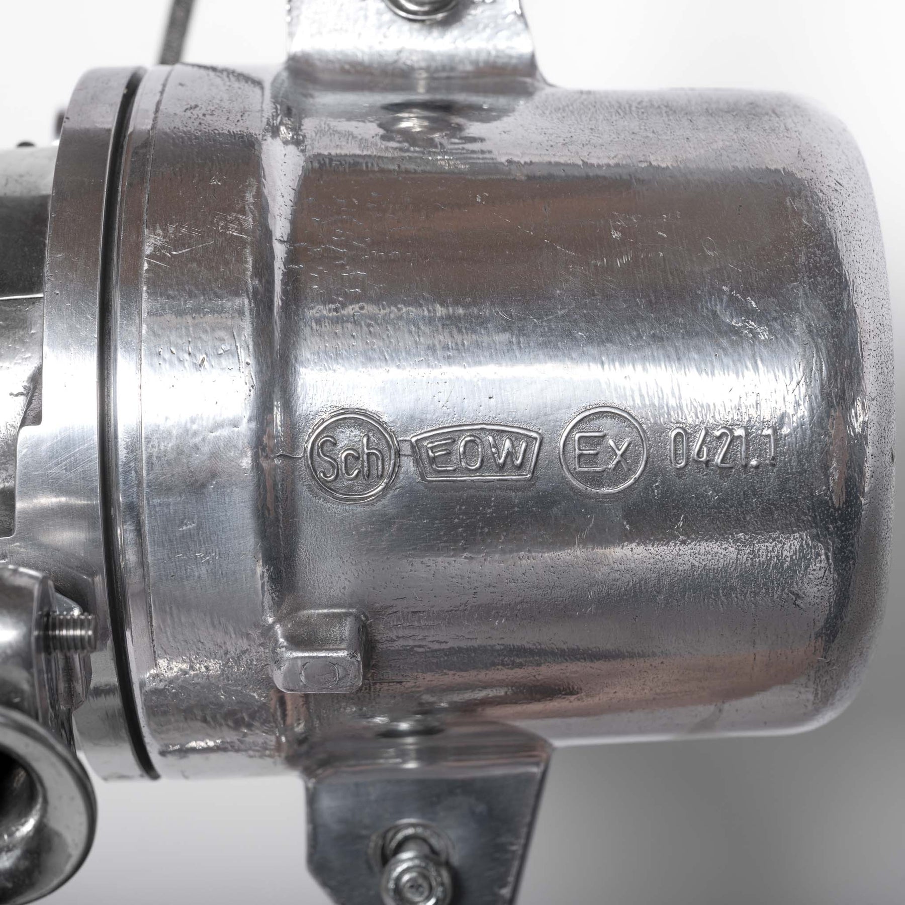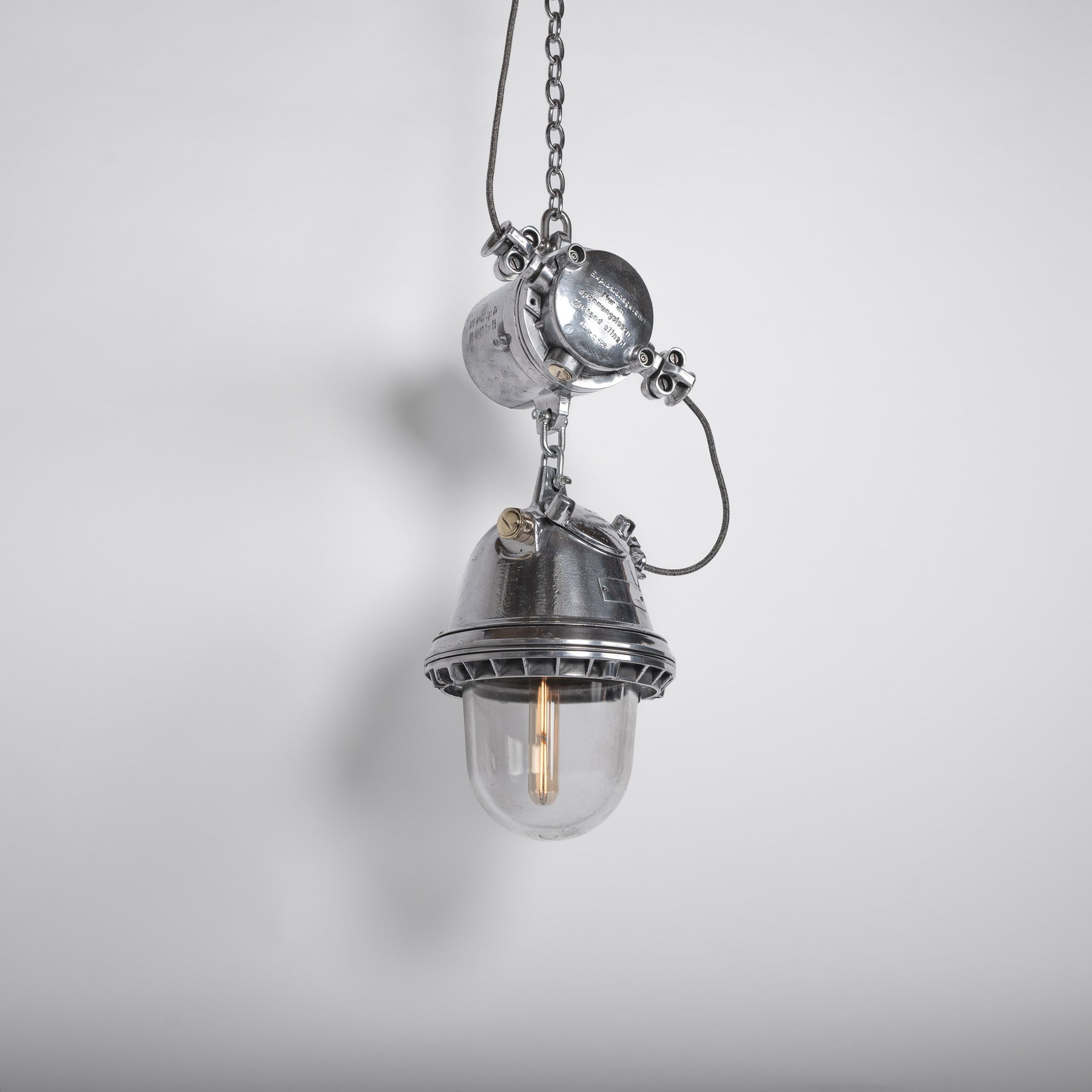 Heavy cast aluminium construction throughout, originally designed for hazardous industrial environments. Now professionally restored, polished and rewired — retaining its industrial scars while presenting with a refined contemporary architectural finish.