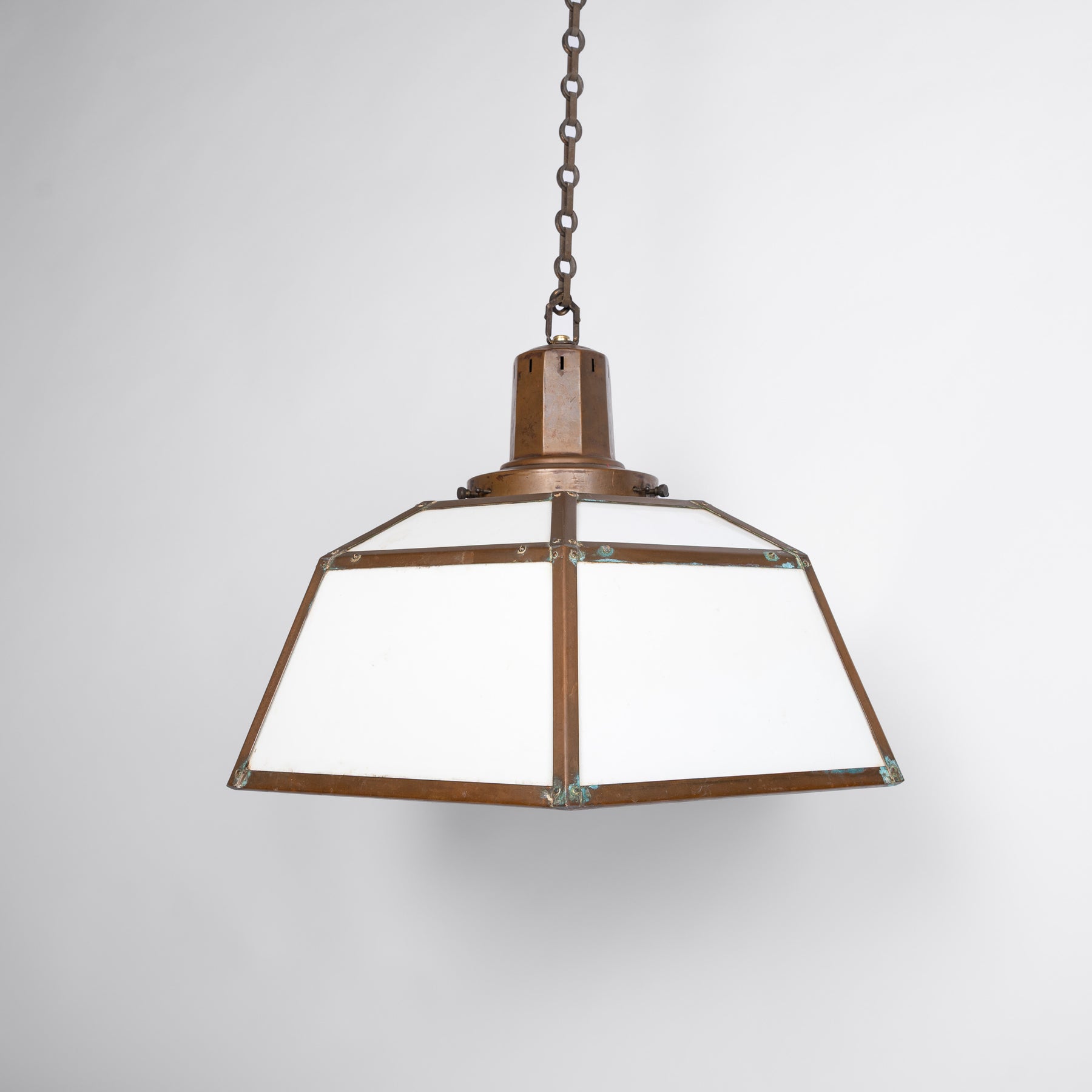 The frame is entirely crafted from copper, forming a large hexagonal shade format with original opal glass inserts. The copper boasts a wonderful patination acquired over years of use, creating a stunning dark brown tone that contrasts beautifully with the white glass panels. The light emitted from the fitting is beautifully soft and diffused.