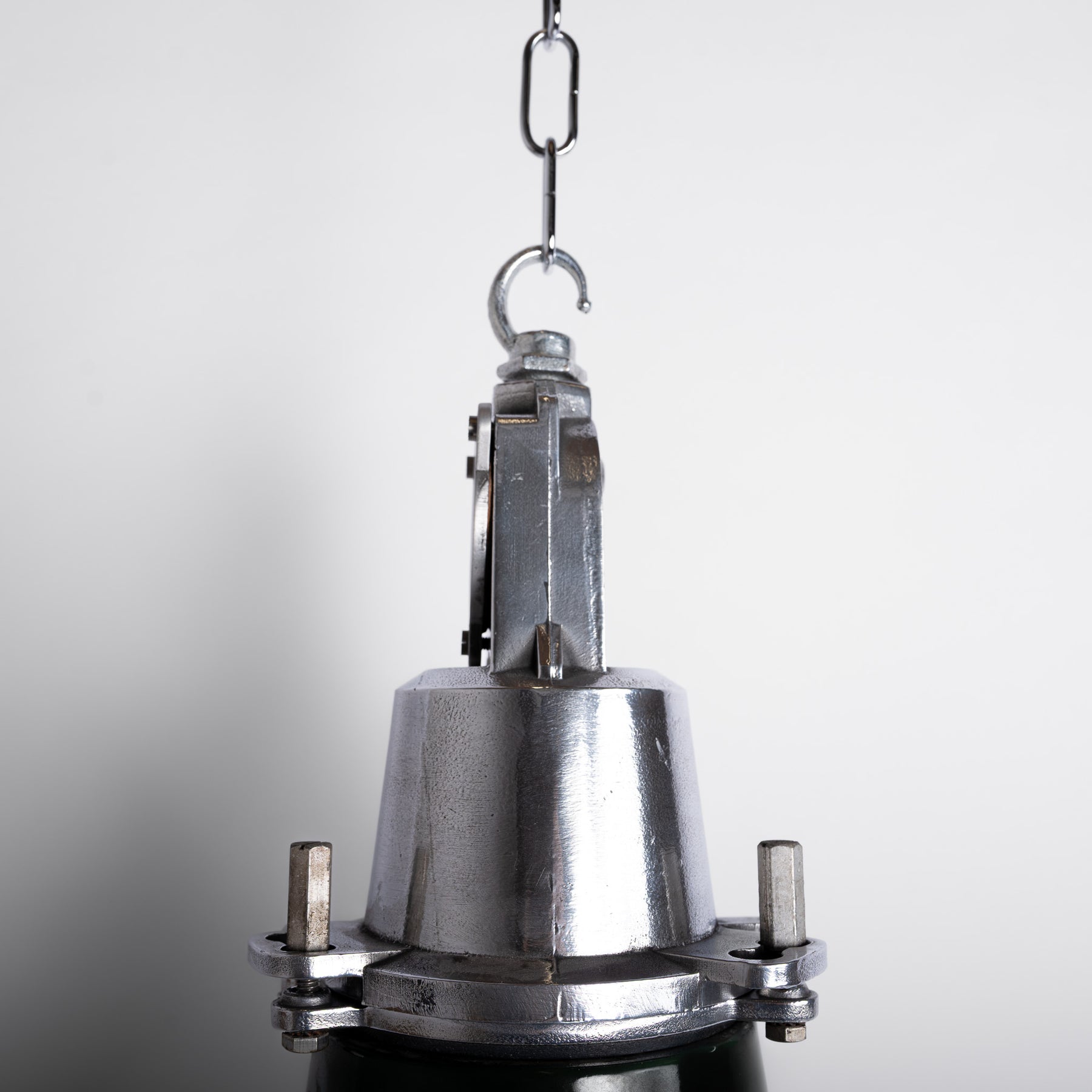 These pendants feature spun steel vitreous enamel shades finished in deep factory green to the exterior with crisp white enamel interiors for optimal light reflection. The upper section is formed from heavy cast aluminium, incorporating a bolted access plate and pronounced clamp ring assembly — a detail that introduces mechanical definition without visual heaviness.