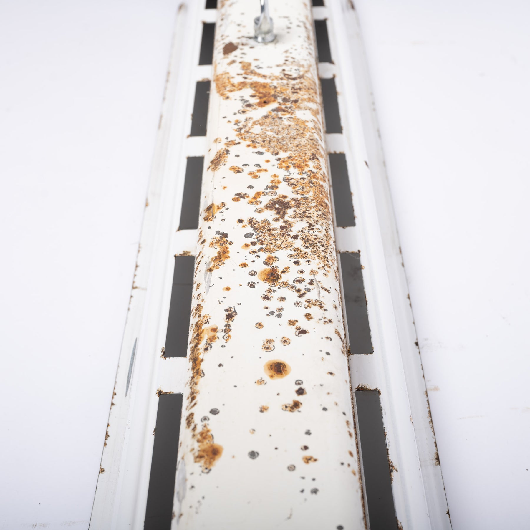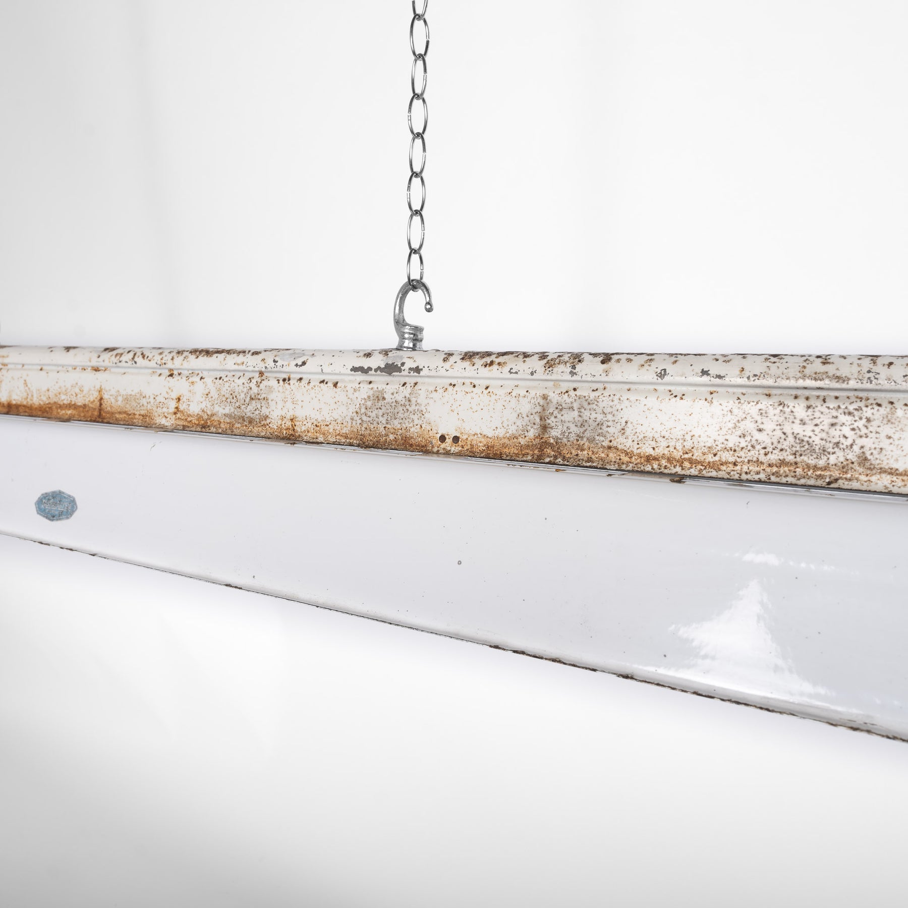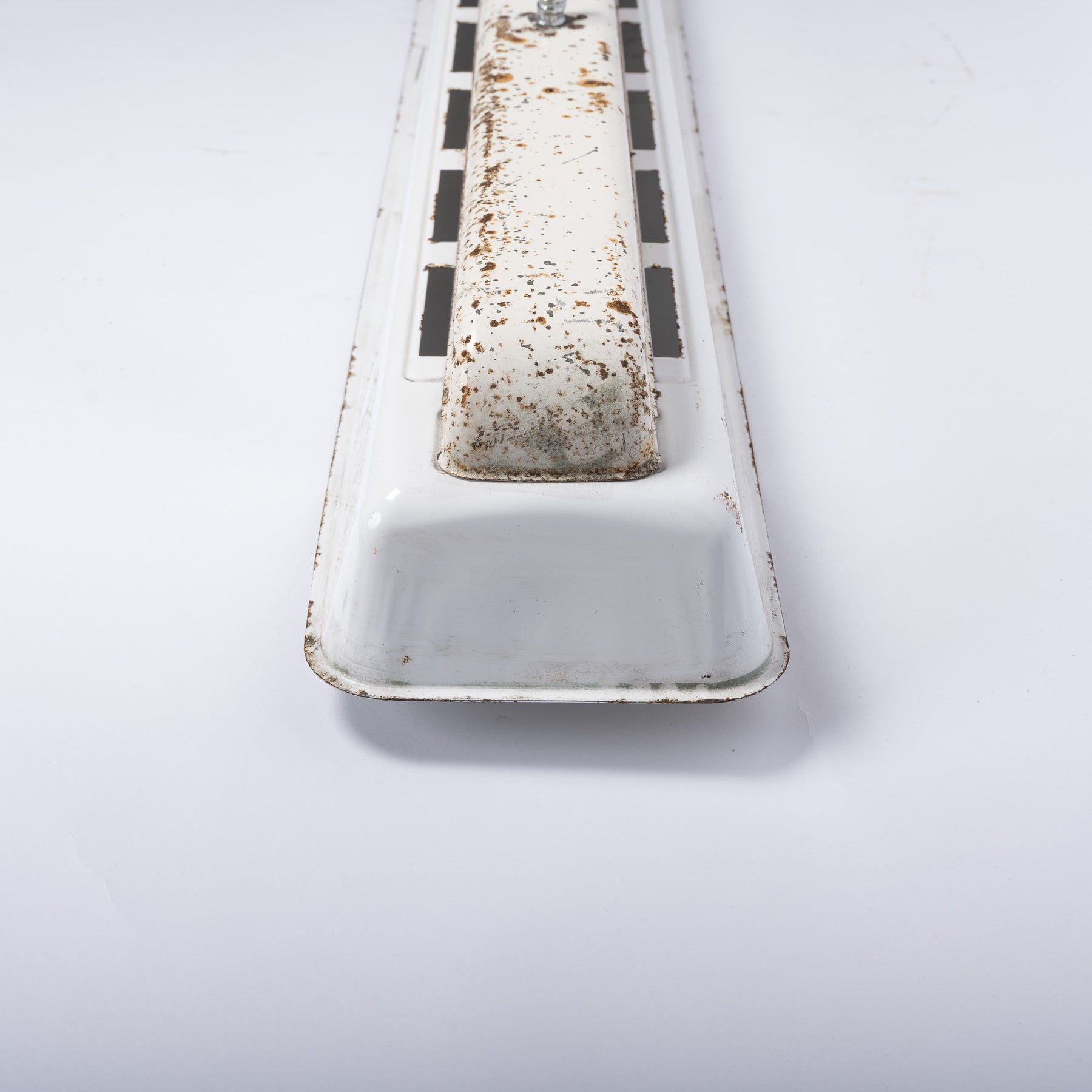 Designed for demanding industrial environments, these fittings combine robust engineering with restrained Art Deco influence. The radiused ends, stepped upper canopy and disciplined vent detailing give them a refined linear geometry — far removed from later utilitarian fluorescent housings.