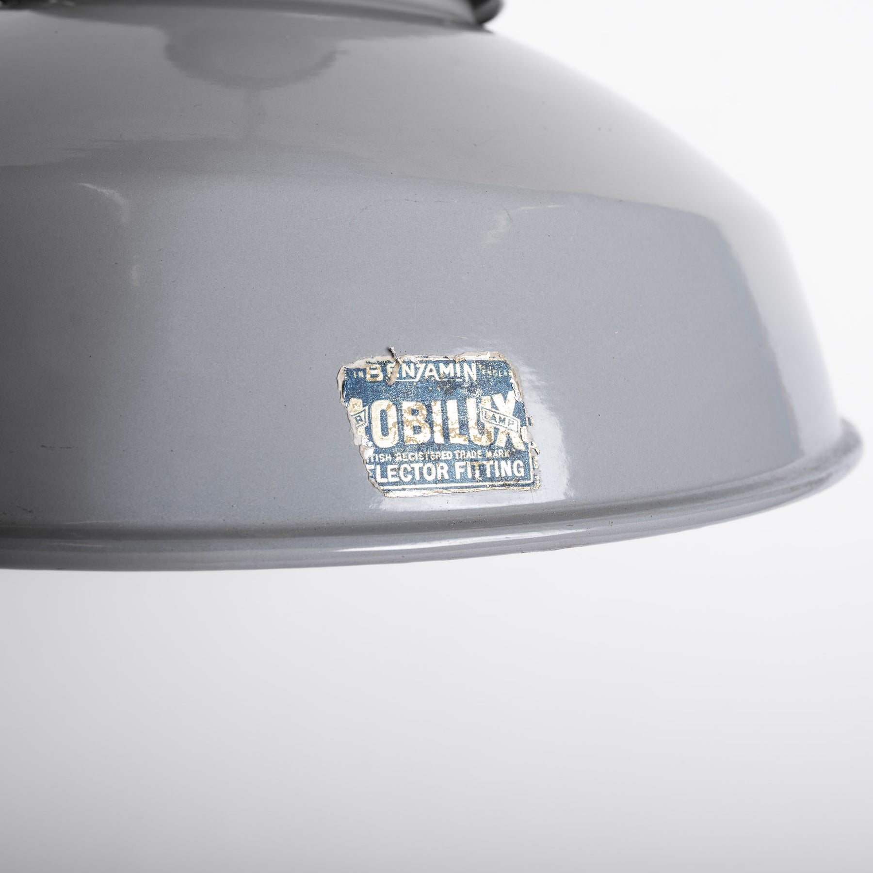 A documented example of the Benjamin Electric “Mobilux” Dispersive Reflector, finished in original grey vitreous enamel with white interior.