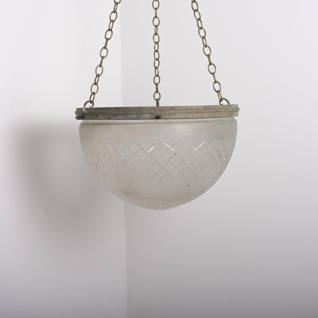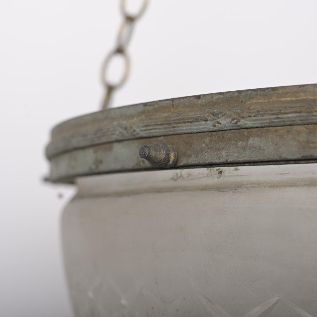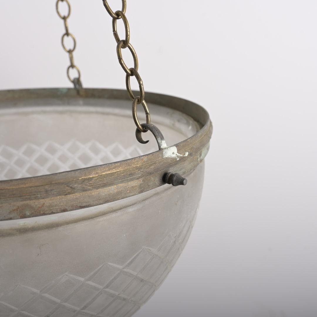 This piece is defined by the distinct profile of its satin crystal bowl. Unlike standard shallower dishes, this glass features a deep, conical shape that resolves to a soft point at the base. The satin (frosted) finish ensures a soft, diffused light output without glare. The glass is suspended from a simple, understated brass gallery rim which retains its natural aged patina and darkened bronze tones.