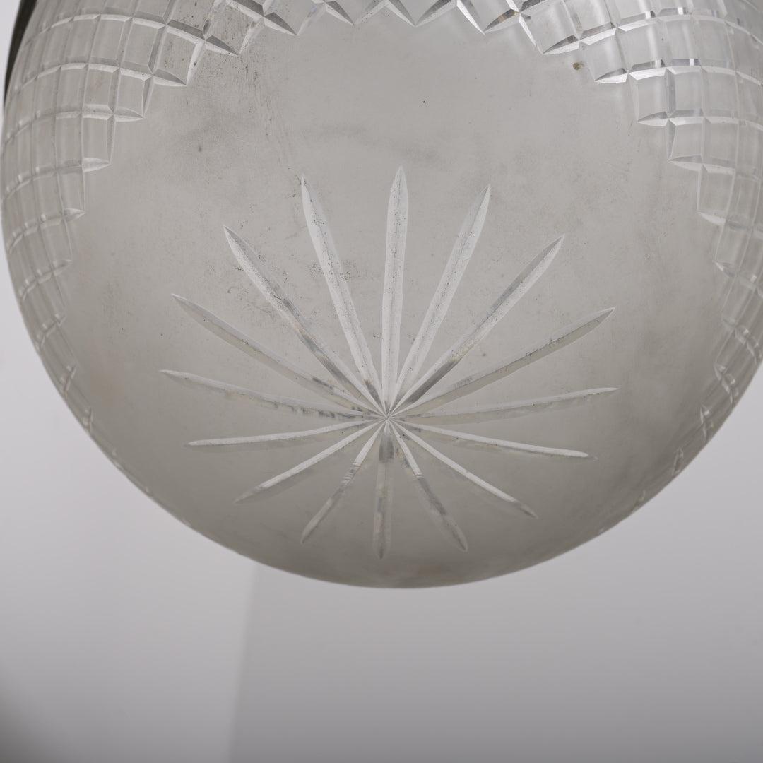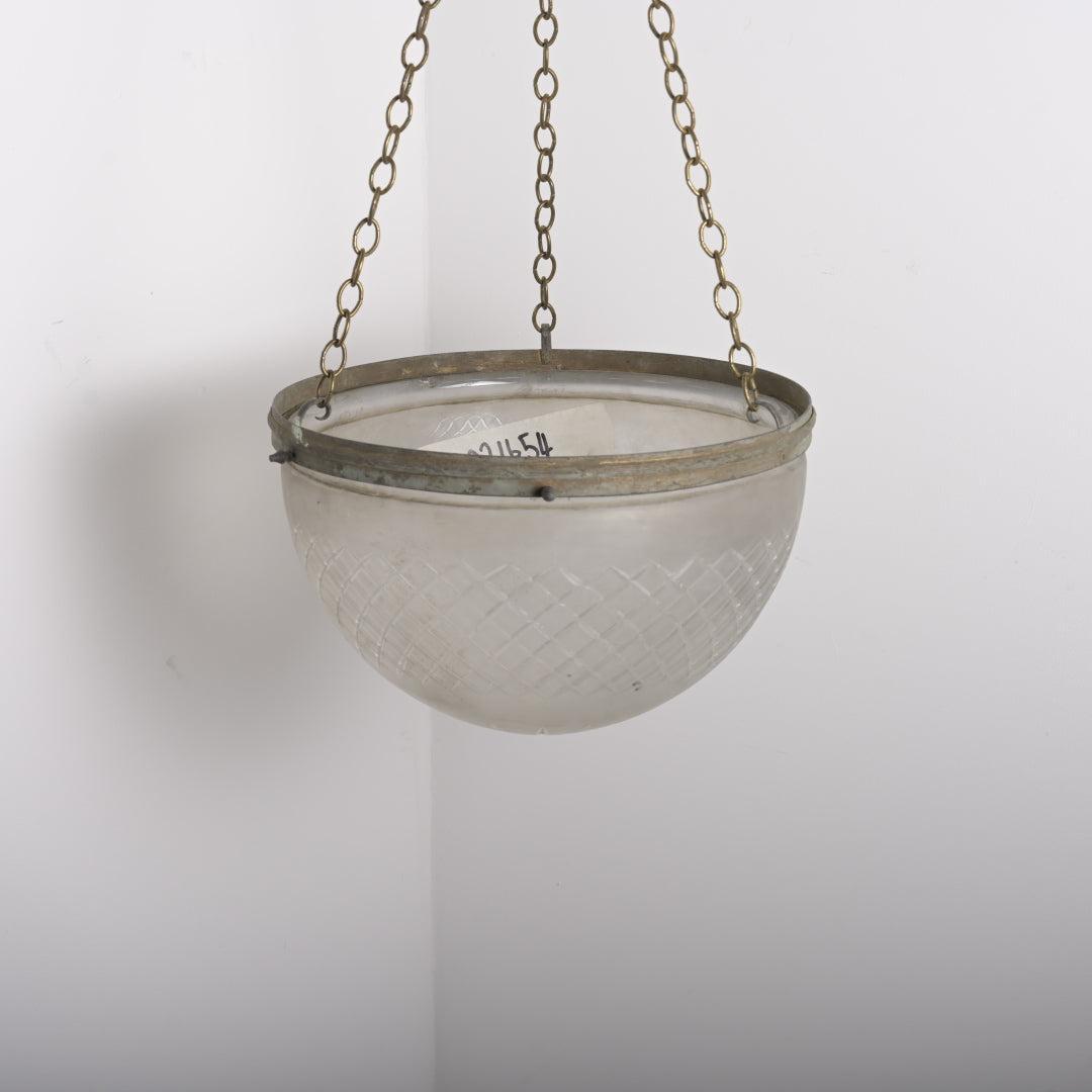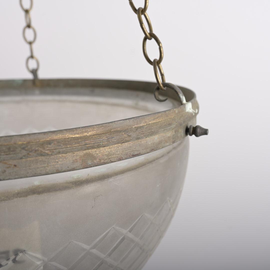 This piece is defined by the distinct profile of its satin crystal bowl. Unlike standard shallower dishes, this glass features a deep, conical shape that resolves to a soft point at the base. The satin (frosted) finish ensures a soft, diffused light output without glare. The glass is suspended from a simple, understated brass gallery rim which retains its natural aged patina and darkened bronze tones.