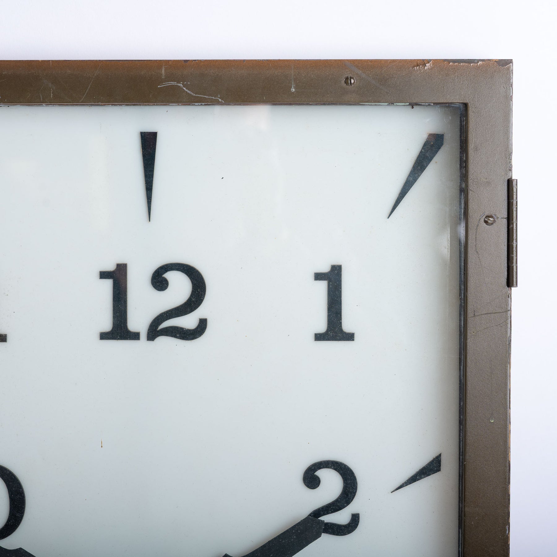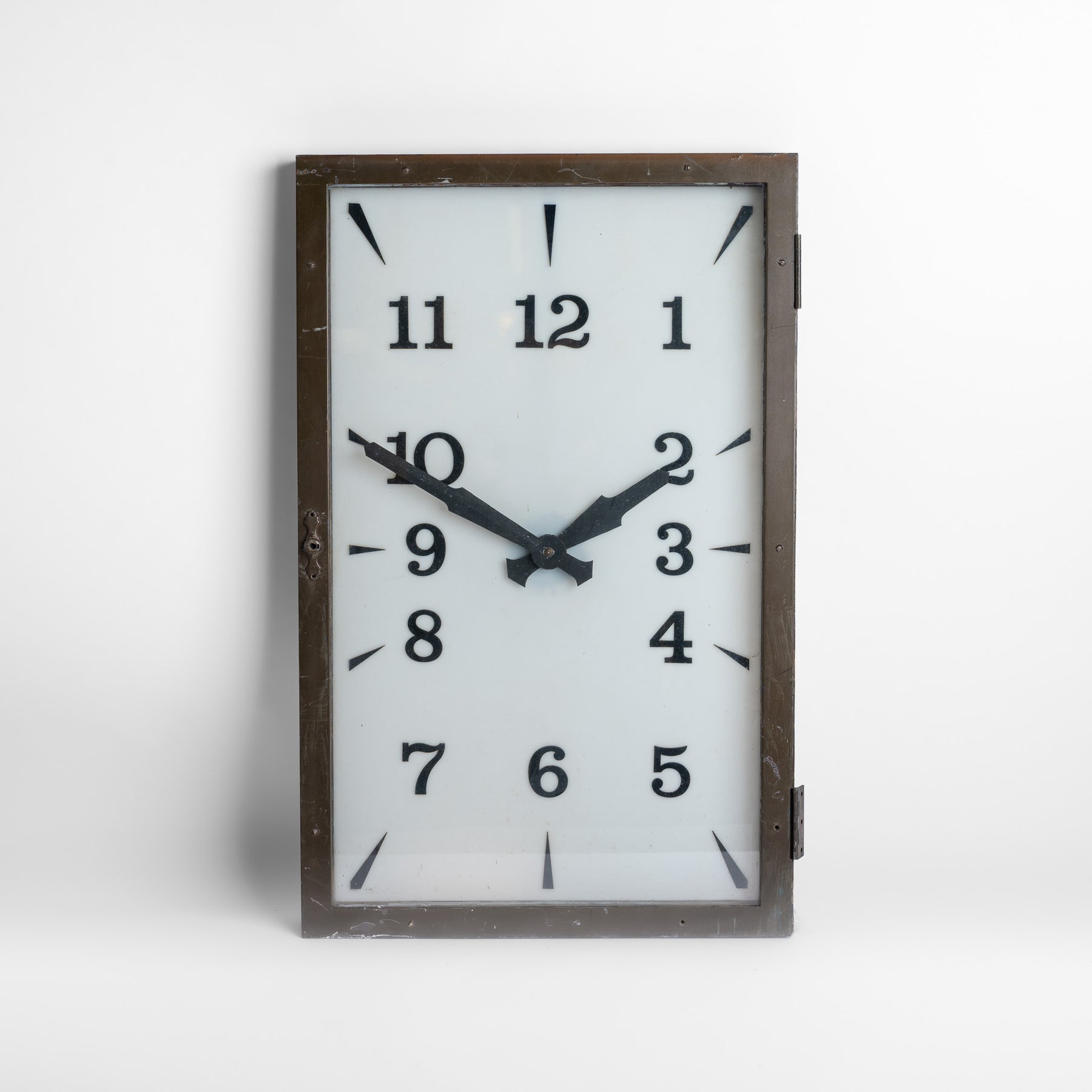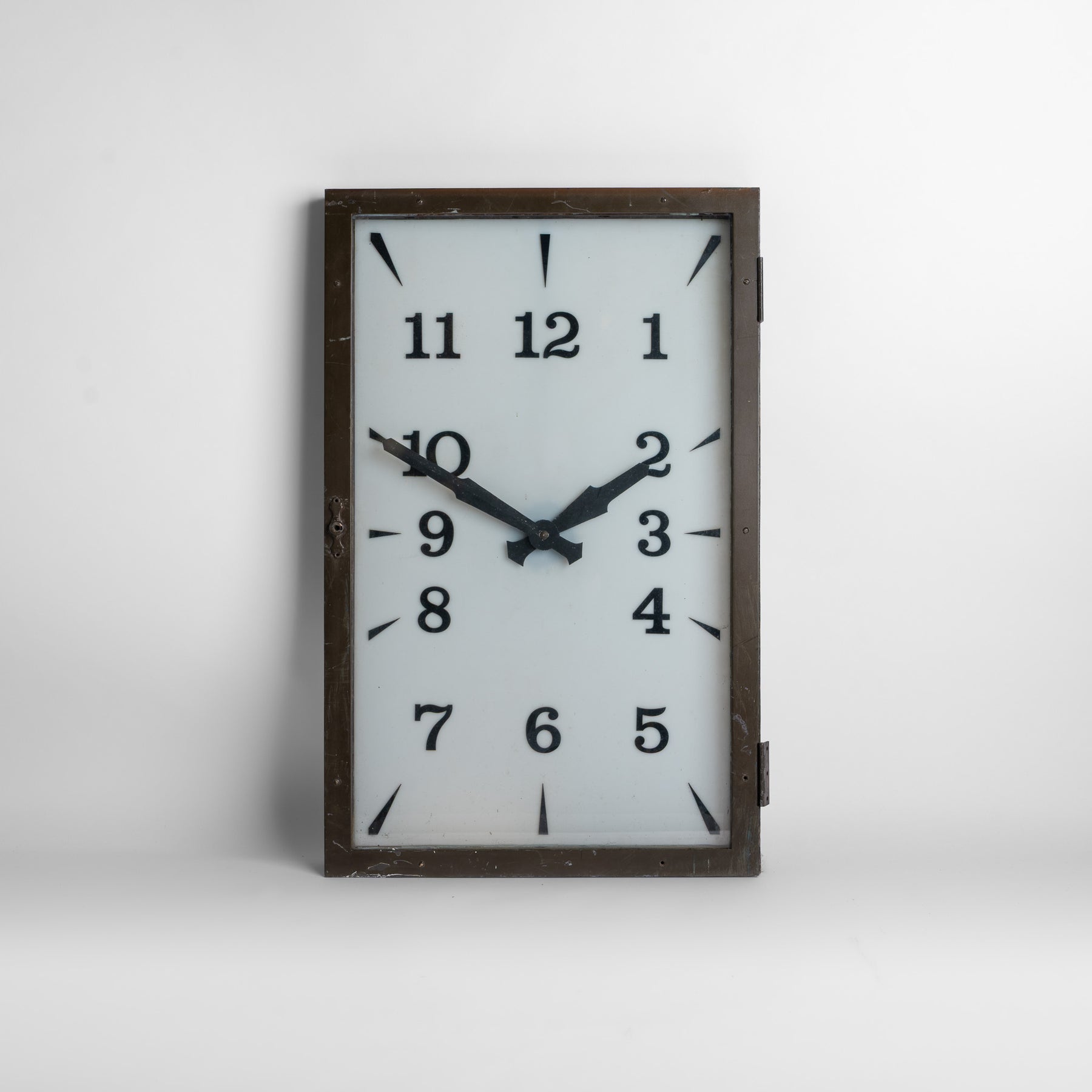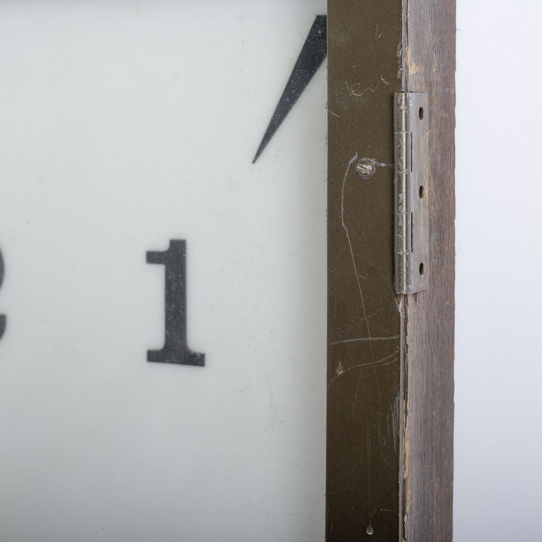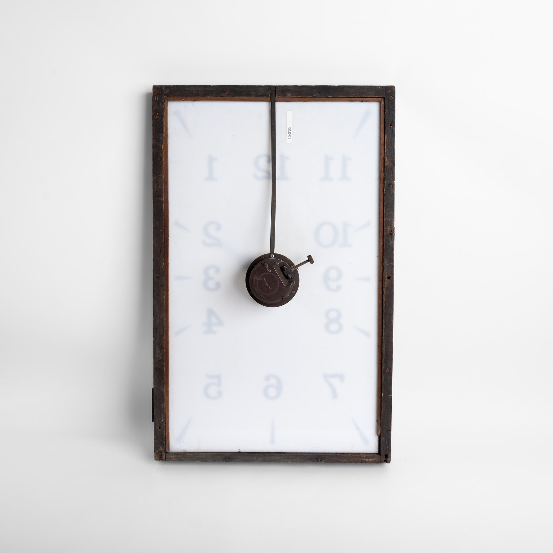 The clock is currently housed within its original timber-constructed, bronze-covered hinged mounting frame, confirming its earlier installation within a wall recess. It survives in found, unrestored condition and will be supplied fully restored and ready for use. As part of restoration, we plan to construct a discreet wall-mounted case to allow the clock to be installed externally while housing new electrical components and LED illumination, ensuring the piece functions reliably while retaining its original character.
